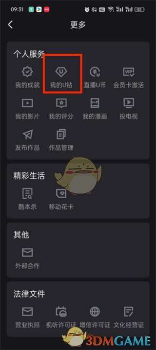 3、接着来到更多的页面中可以看到有我的成就、我的U钻、直播U币、会员卡激活等功能,我们点击【我的U钻】;