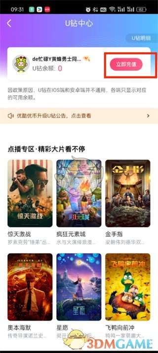 4、进入到U钻中心的页面中可以看到U钻的余额,在这里我们点击【立即充值】;