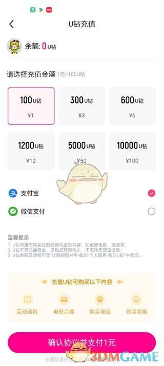 5、最后点击过后在U钻充值的页面中我们选择充值金额和支付方式之后点击【确认协议并支付】即可。