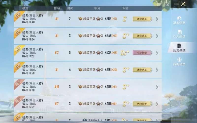 想要上无敌战神这个段位是需要有很强的实力的,这个段位比较特殊,是没有固定的分数段的,它是需要我们先达到超级王牌的段位,也就是积分需要达到四千两百分的时候才有机会。然后第二个要求就是,积分的排名要在全服的前五百名才可以,因为每个时期的无敌战神的积分不一样,所以没有固定的积分段,但是差不多也要达到五千分左右吧!