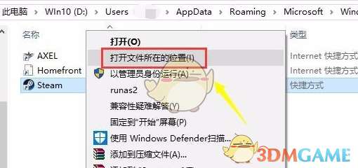 2、进入快捷方式文件夹,右击steam快捷方式,选择打开文件所在位置。