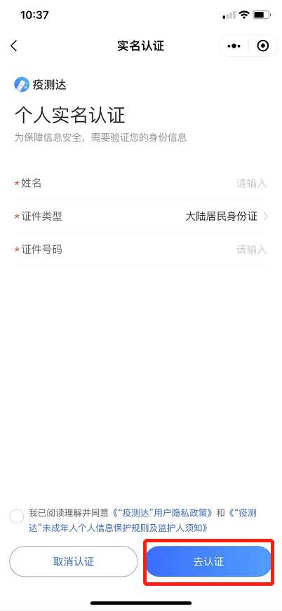 2、进行实名认证,将个人证件填写完整并点击去认证,之后进行人脸识别。