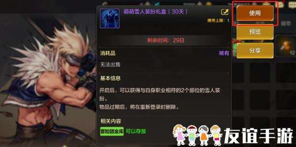 6、使用后会得到一个“萌萌雪人装扮礼盒(30天)”,同样在消耗品中可找到,点击“使用”;
