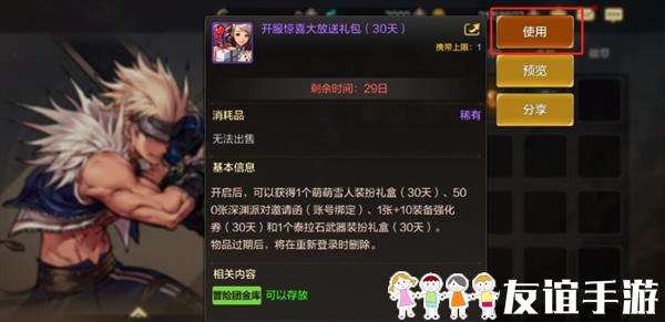 5、再通过游戏的“背包”,进入“消耗品”中找到该礼包,选中点击“使用”;