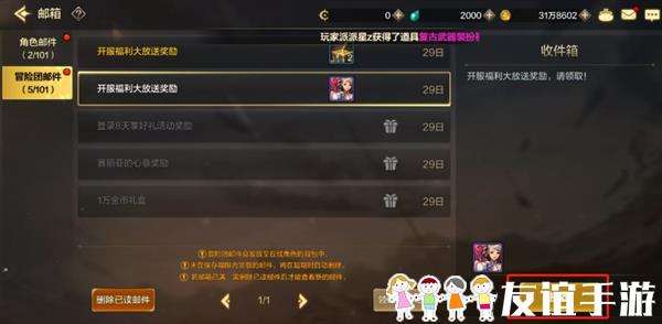 4、领取后需要通过游戏的“邮箱”,在“冒险团邮件”内领取该礼包;