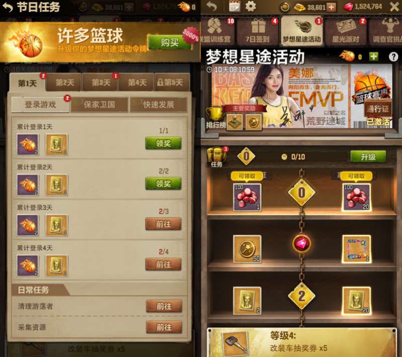 【梦想星途】活动,玩家只需完成当日活动任务即可获得活动道具。在世界地图上消灭游荡者或者采集资源也可以获得额外活动道具,解锁各种奖励。【星光派对】活动可以通过完成每日任务/消耗钻石/付费购买/免费领取(24小时刷新)等方式获得入场券。