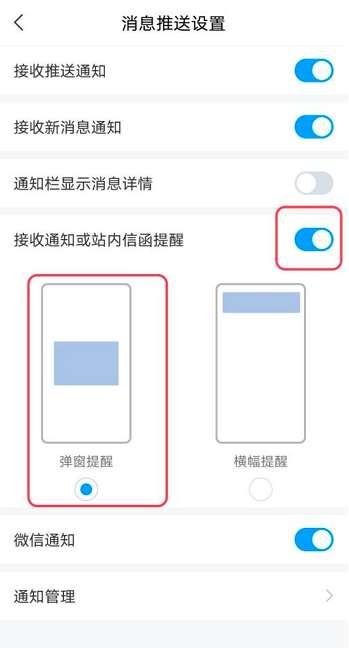 第三步:接着打开“接收通知或站内信函提醒”,开启“弹窗提醒”即可。