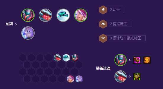 前期建议用斗士过渡,搭配三原计划和两情报。三阶段六人口小搜,搜VN和锐雯。