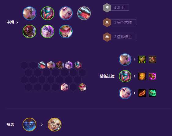 前期尽量用强势棋子与羁绊打工,保证打工棋子2星,进而稳定血量健康,步入7与8阶段,7与8阶段低费打工卡向以4-5费棋子为核心阵容转型。
