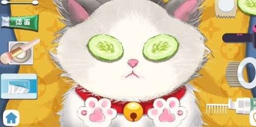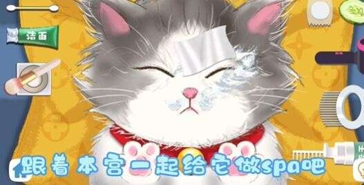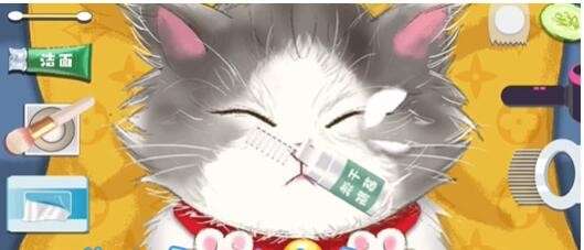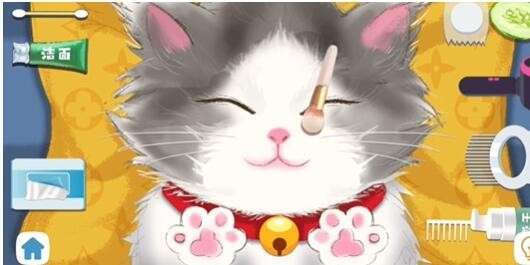 6、第六步:然后再用左边最后一个道具面巾给猫猫擦干净。
