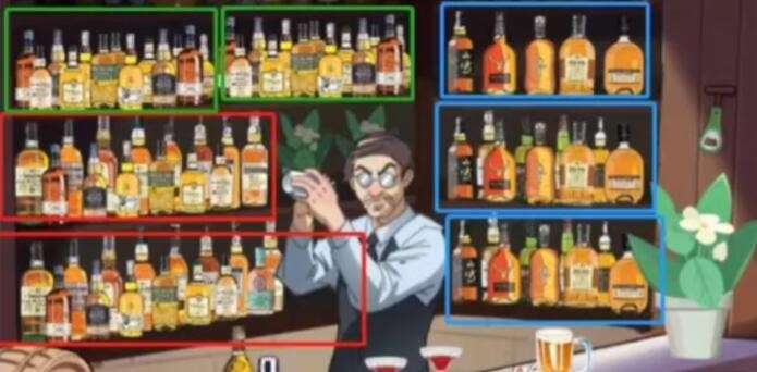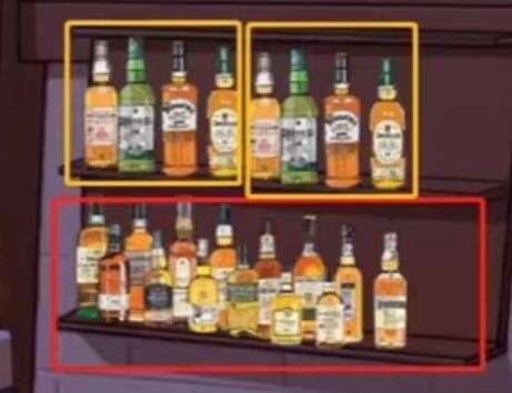 3、大叔左下两排酒瓶摆放顺序大致相同,右边三排也基本相同,最上层的酒少一些