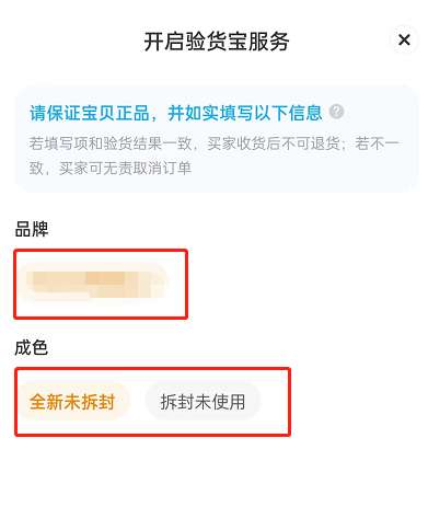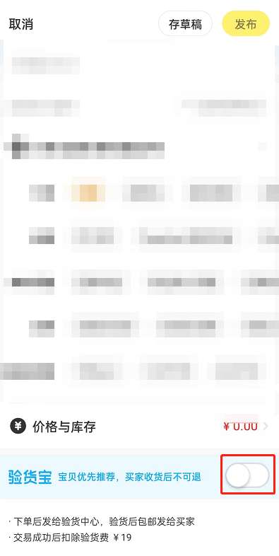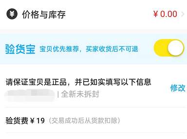 3、接着,填写好商品信息,选择好商品标签后,滑动到最底部,打开验货宝右侧开关。