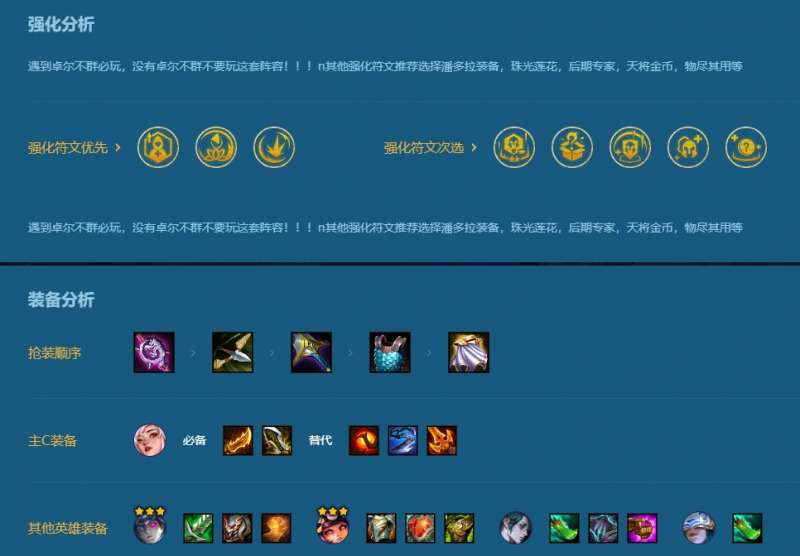 没有卓尔不群一定不要玩这个阵容,因为这个阵容就是靠着卓尔不群的加成提升战力的。装备方面主C刀妹推荐【红buff,无尽,破甲弓】可以最大化刀妹的输出,羊刀尽量不给,虽然会越打越强,但是没有红buff的伤害来得快,并且红buff还有重伤。凯隐【正义,饮血,泰坦】三件基本不变。安妮带常规肉装即可,一般是有就给。慧【青龙刀,鬼书,帽子】最大化输出的同时能搭配刀妹的红buff让敌方全体成员挂上重伤。另外有多的装备可以在冰女和奥恩之间选择。冰女功能