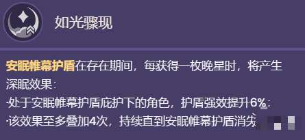 安眠帷幕护盾在持续期间内,将每1.5秒产生1枚依附其上的晚星;处于该护盾庇护下的角色施放元素战技时,也将产生2枚晚星,每0.3秒至多通过这种方式产生一次晚星,至多同时拥有4枚晚星。