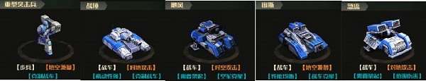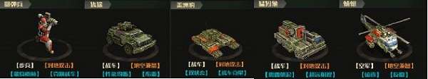 2) 兵种方面:掷弹兵、勐犸象建议优先制造(都为二级兵种且对坦伤害高,性价比高)犰狳保持2-3辆即可主要需要其埋雷,2-3辆可以保证短时间内埋下足够数量的地雷,这三种兵种需要全程注意损耗,蜻蜓坦度较高,虽然对空对坦伤害一般但是泛用性高,美洲豹成本高后期使用。