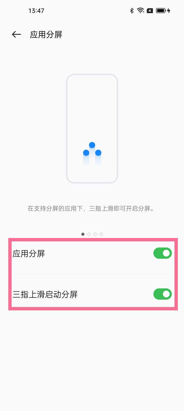 2、点击应用分屏,打开应用分屏和三指上滑启动分屏右侧开关。