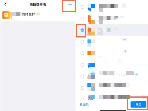3、在联播群列表界面点击右上角的添加图标,再勾选需要一起开直播的群,点击确定即可。