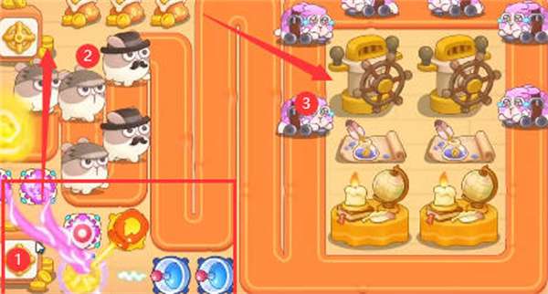3:第三场,我们这一关使用电磁塔开图然后我们用输出雷达就好了,我们首先解决左下角的位置,然后在开左上角的道具,最后在去开右侧的道具,然后我们最后放置炮塔的位置如图所示。