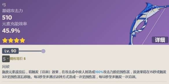 满级面板510攻击力加45.9%充能效率,满精特性是释放e技能后,攻击敌人造成160%攻击力的物理范围伤害,12秒内最多可触发三次。对比其他四星充能弓是多了伤害上的优势但物伤偏向鸡肋还不如落霞的全增伤,而且充能弓更需要祭礼或西风那样的功能性,特性又和须弥主打的元素精通沾不上边。之前的鱼叉起码给雷神或香菱用都相当不错,但“竭泽”目前来看并没有特别适合的角色,哪怕作为角色平替武器也有不少更好的选择。或许能期待的就是特性的特效了(参考咸鱼大剑),加上外观偏奇葩说不定整活能用上。