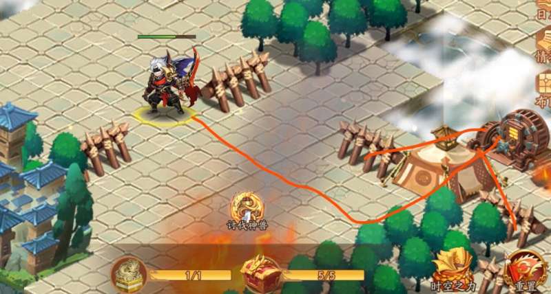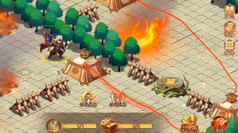 在进入章节后,玩家需要沿着道路往前走,将遇见的第一个帐篷直接摧毁掉。随后会跳出剧情,告诉玩家需要去寻找什么道具。接着继续往前面走,会看见第一个宝箱,放在一个帐篷的后面。玩家将挡路的帐篷击毁,就能够打开宝箱获得道具了。点击帐篷就会有士兵跳出来与我们对战,玩家需要尽可能的保护核心输出。随后我们需要往左边走,在这里可看见一个机关。