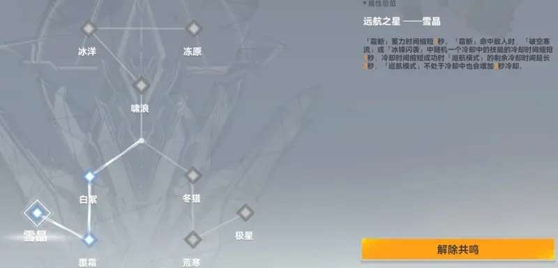 【雪晶】:蓄力普攻(霜断)蓄力时间减少1秒,蓄力普攻(霜断)命中敌人时,将会减少1或2技能,1秒冷却时间;冷却时间成功缩短时3技能将会进入3秒冷却时间或者延长3s冷却时间。