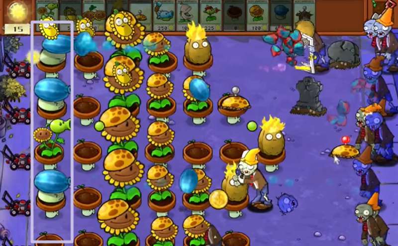 2、开局我们先产阳光,然后把距离我们最近的墓碑清理掉,清掉之后会生成一个土豆雷,这时候这条路就不需要放置输出炮塔了。