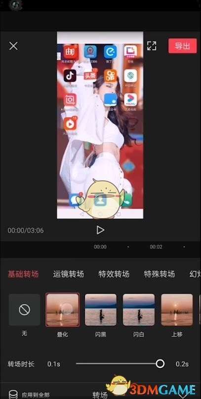 2、有基础转场,运镜转场,特效转场,特殊转场,幻灯片可供选择。选择你喜欢的转场添加,可调整转场时间。