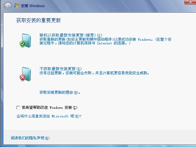 2、整个屏幕被win7安装界面覆盖(此时要切换到其他操作按win键),并在屏幕中央出现如下画面,选择“不获取最新安装更新”。