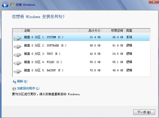 5、出现下图问你将windows安装到何处,自己用上键(↑)和下键(↓)选择合适的分区(不能选择当前系统活动的分区用光盘启动才可以安装到任意分区),选择好后回车进行下一步。