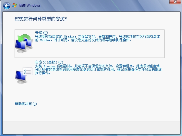4、出现安装类型选择界面,上键(↑)和下键(↓)移动到“自定义(高级)”选项(或鼠标选择)继续。