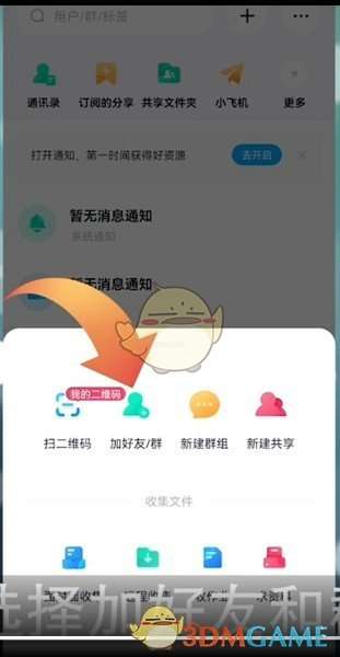 2、在共享界面之中点击上方加号然后选择加好友和群进入。