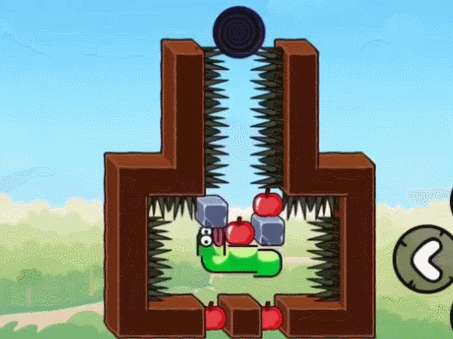 1、先把头上的石头向顶一格,然后吃掉左侧的苹果,