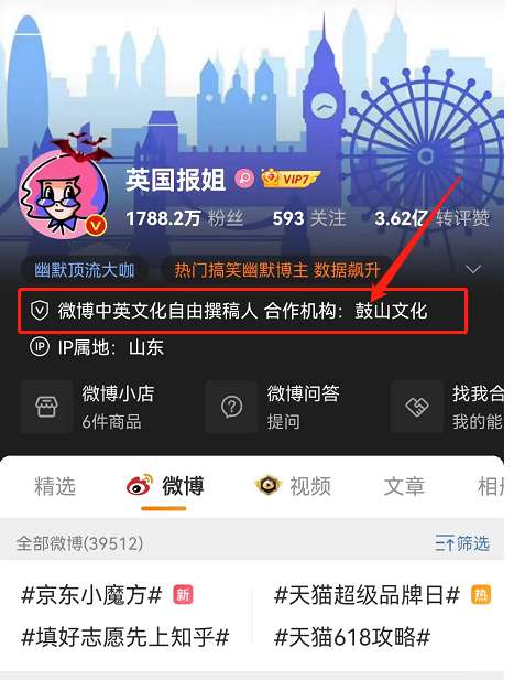 3、进入主页后在ip属地的上方用户们就能看到博主所属的mcn机构啦~