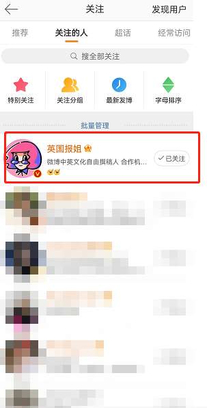2、在关注列表中找到你想查看的博主点击进入主页。
