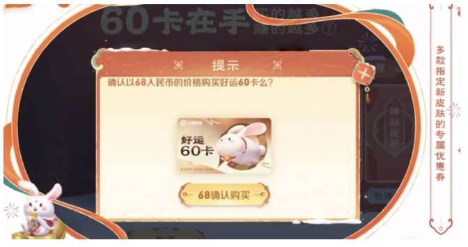 1、好运60卡的售价是68元,玩家购买后可以获得多款指定新皮肤的专属优惠券,其中就包含五款兔年限定皮肤,想要购买今年的限定皮肤,使用好运60卡购买皮肤会更便宜。