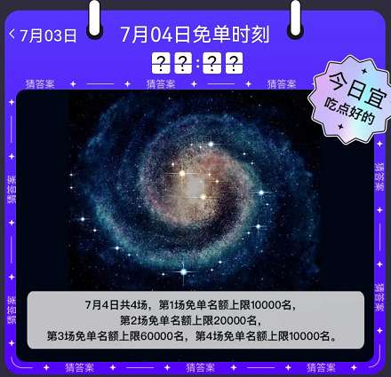饿了么免单1分钟7月4日答案已经更新了,今天的题目又是与天文相关的,不知道大家有没有推测出线索。下面小编就为大家带来了饿了么免单一分钟7.4答案,饿了么免单1分钟7月4日答案,希望对你有所帮助。
