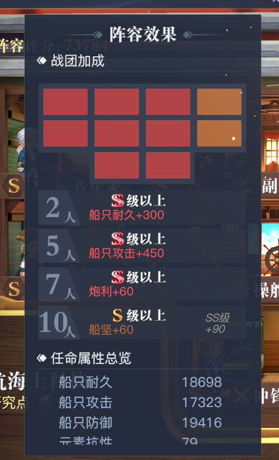 当我们任命SS、S航海士到达标准后就可以激活对应战团效果,激活前置、效果如下表;