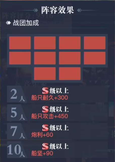 1、战团加成仅计算最高品阶,触发2位SS航海士战团加成后,将覆盖2位S航海士战团加成效果,所以高品阶加成触发后无需在意低品阶搭配。
