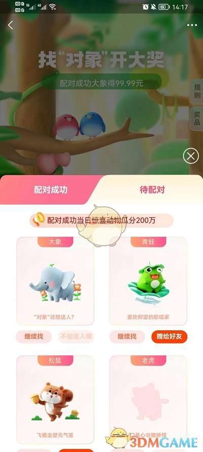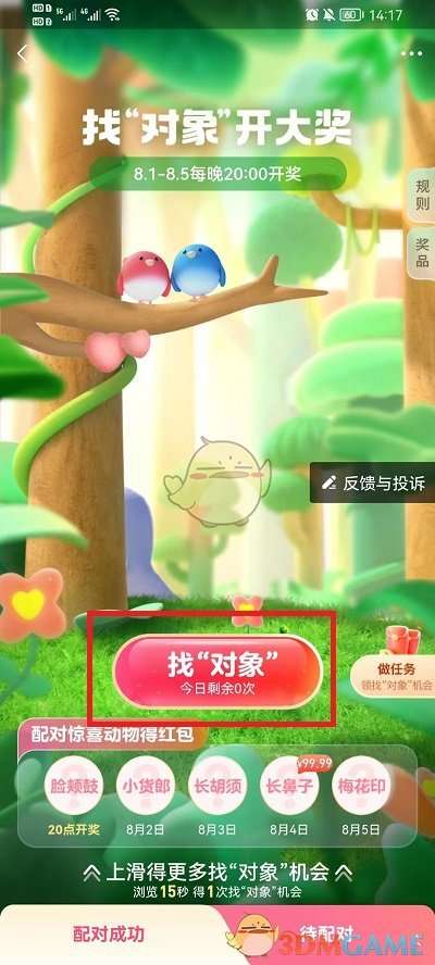 2、在活动中可以看到下方的找“对象”按钮,每个用户初始会有两次免费机会,点击就可以获得动物卡片,两张相同的卡片可以配对成功;