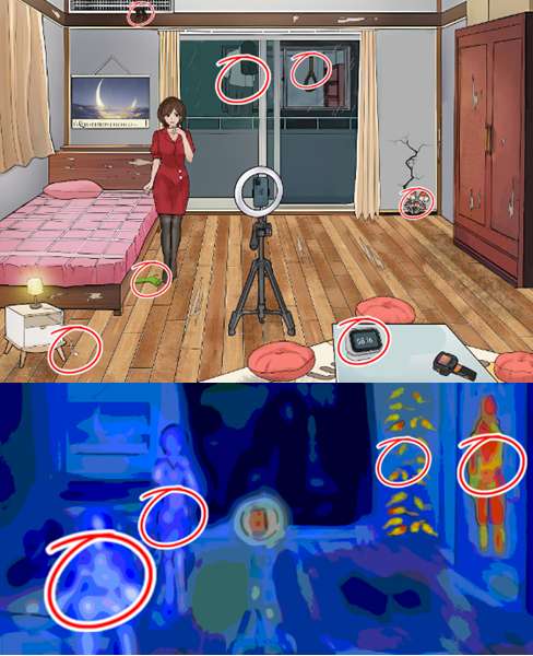 4、点击桌子上的体温枪,可以看到:柜子中有温度的人、床上的飘影、主播没有体温,墙内有体温的老鼠。