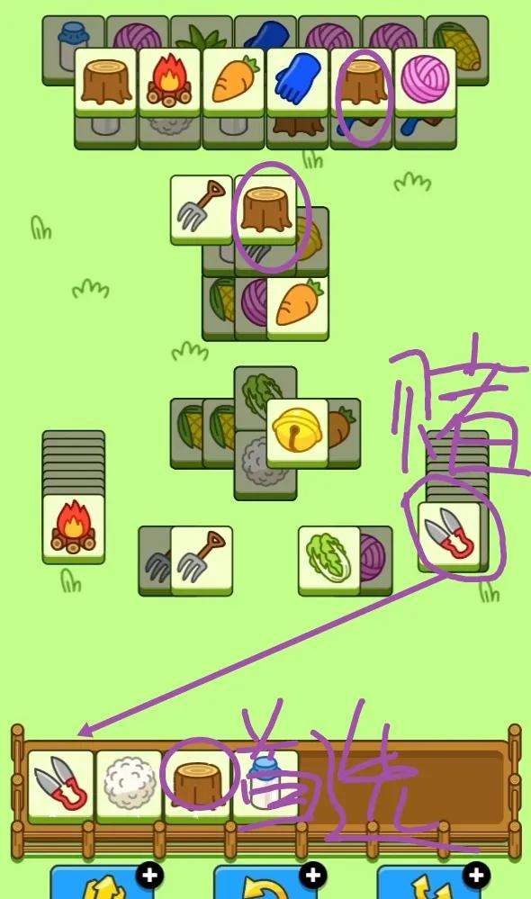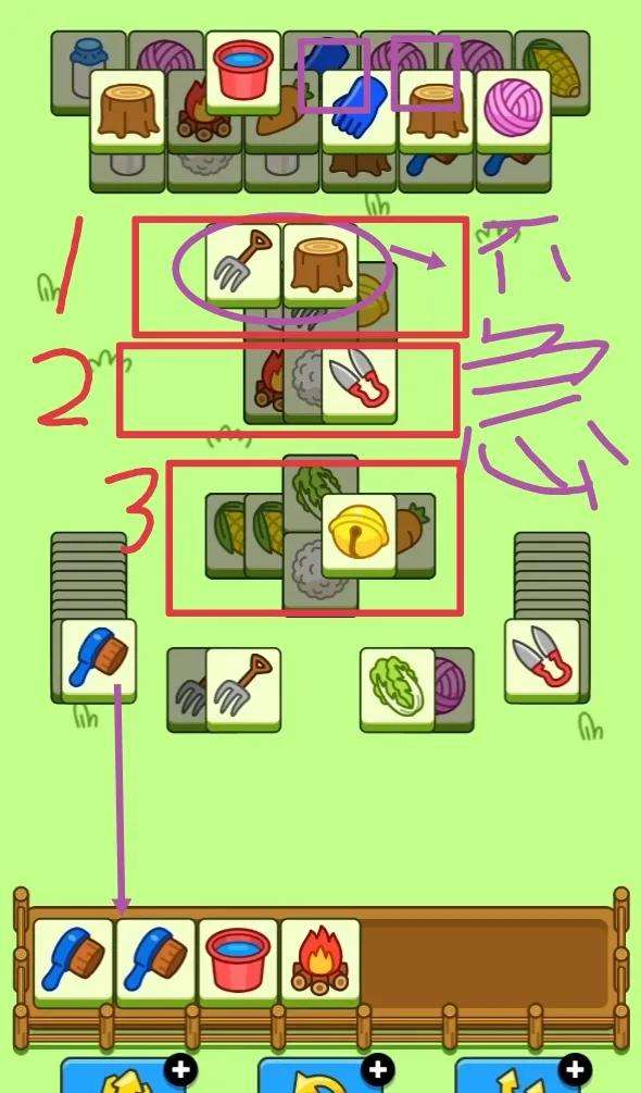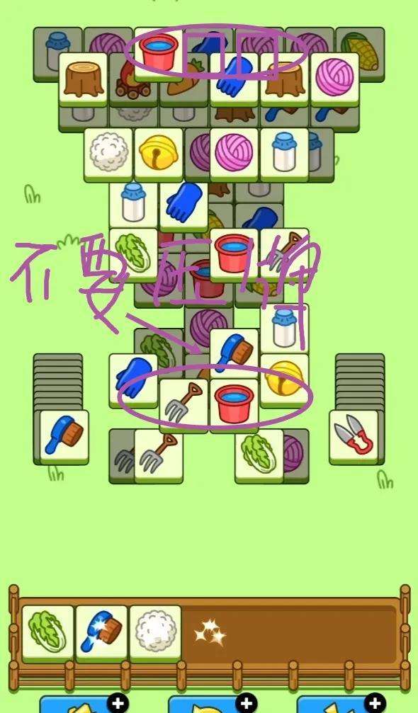 首先对主攻区的大平层和小平层依次进行消除,前两排高处优先,消除过程尽量持平,不压牌(不能完全平);盲盒不动,先使用急救牌!