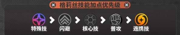 加点优先:特殊技、闪避、核心技;普攻和连携技,在前期资源匮乏的情况下优先级较低,普攻由于偶尔会穿插打出,优先级略高于连携技。