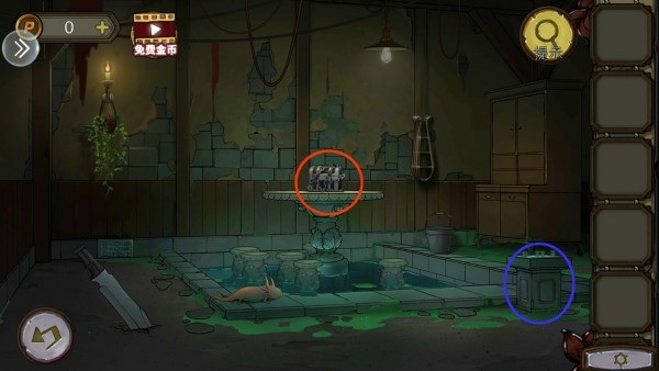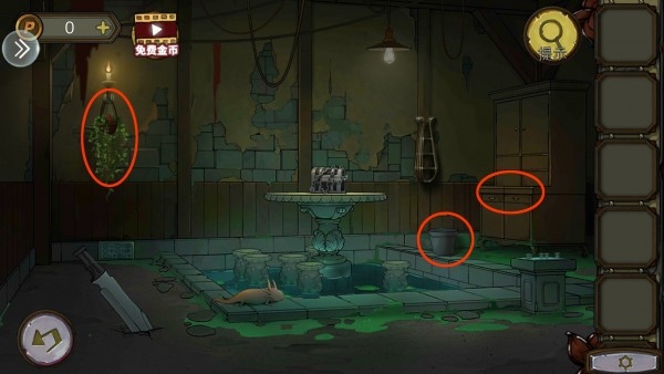 用罗盘里的【钥匙】打开绿门,用【闪光弹】赶走老鼠。