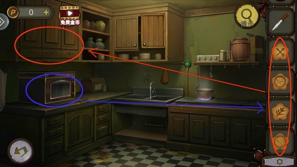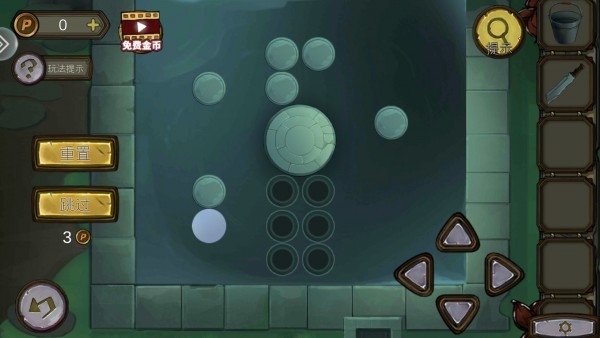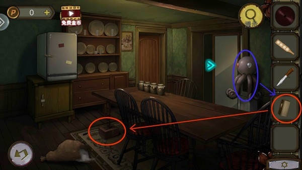 狗粮罐头喂狗,拿到棋子。棋子放棋盘上,调整箭头让棋子到终点,拿到钥匙。