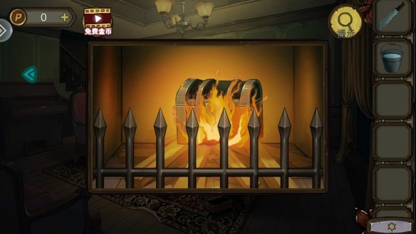 解开“推箱子”机关,到池中间拿到铁箱和火柴。