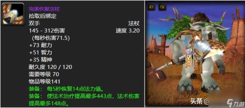 如果说狗杖是术士的完美武器,那么完美恢复法杖就是牧师的更爱,杖如其名字一般几乎完美到无懈可击,特别是T5套牧师外貌协会的那还必须得拿下它,你不追求极致治疗的话,就这配置打打黑暗神殿是没有任何问题的。太香了。