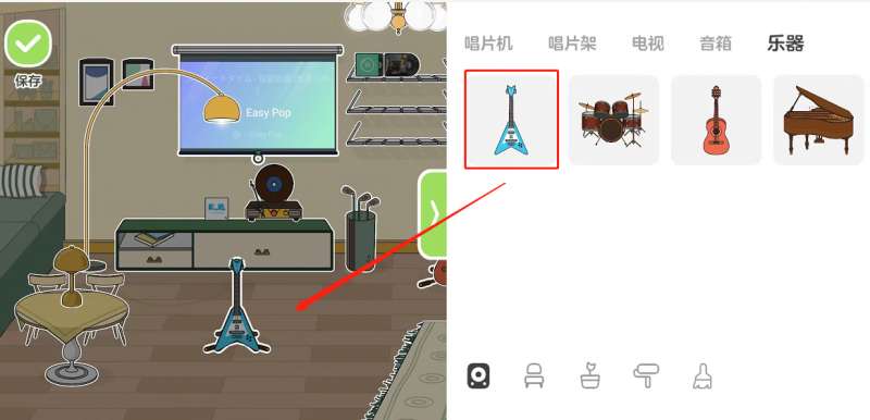 3、点击乐器,选择想演奏的乐器,拖动到音乐空间里。