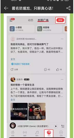 1、打开网易云音乐,找到【关注】,选择发帖。