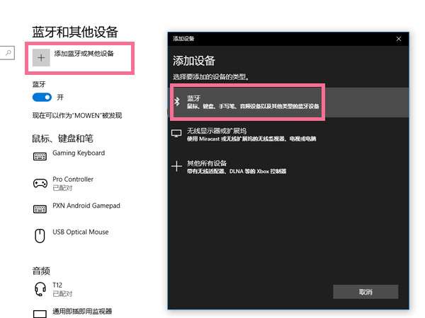 2、选择电脑蓝牙,找到【添加蓝牙或其他设备】,打开键盘名称,此时会出现一组配对数字,在键盘上输入这组数字后按回车键即可。