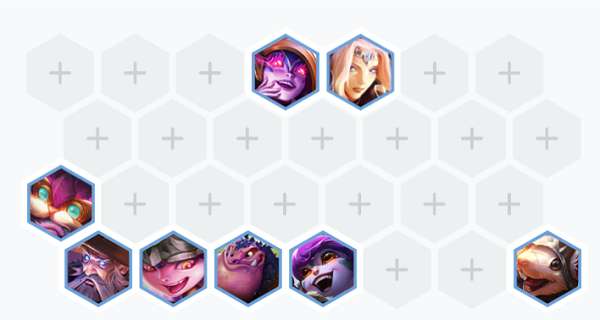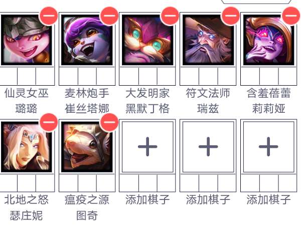 站位讲解:将蛙妃诺姆希放在露露旁边吃圣杯的加成,猪妹和莉莉娅放在前排去抗伤害,将瑞兹放在